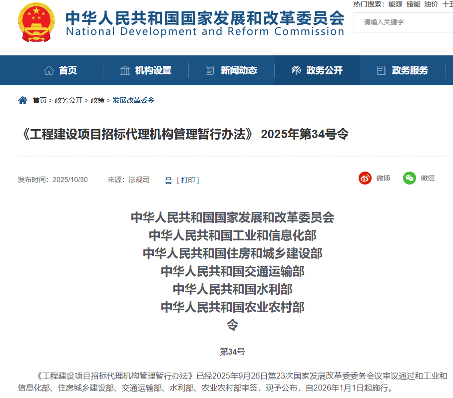 《工程建設(shè)項(xiàng)目招標(biāo)代理機(jī)構(gòu)管理暫行辦法》已經(jīng)2025年9月26日第23次國家發(fā)展改革委委務(wù)會議審議通過和工業(yè)和信息化部、住房城鄉(xiāng)建設(shè)部、交通運(yùn)輸部、水利部、農(nóng)業(yè)農(nóng)村部審簽,現(xiàn)予公布,自2026年1月1日起施行。